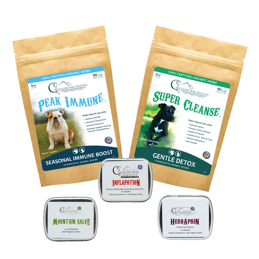 Stock up on our 5 Best Sellers at a never before seen price. These items are all 100% organic and wonderful to have on hand in your pet first aid kit. Is someone sneezing? Reach for Peak Immune™. Slow on the stairs? Try Inflapotion®. Get into something nasty in the garbage? Definitely reach for the Super Cleanse™.  Wishing for rest and relaxation? HerbAprin®. Sores & bug bites? Mountain Salve®. Our work here is done.